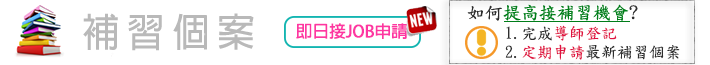 | 個案編號 | 補習地區 | 性別 | 年級 | 科目 | 時薪 | 補習時間 | 特別要求 | 更新日期 | |